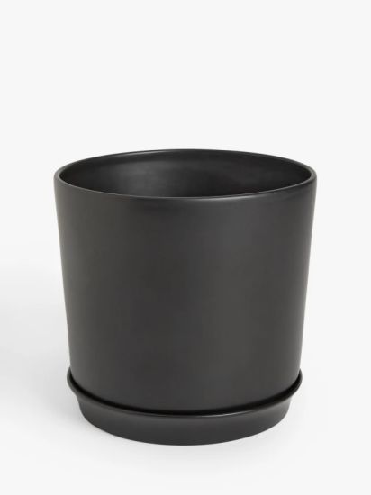 Glazed earthenware planter with drainage hole and matching tray, suitable for indoor and outdoor use.